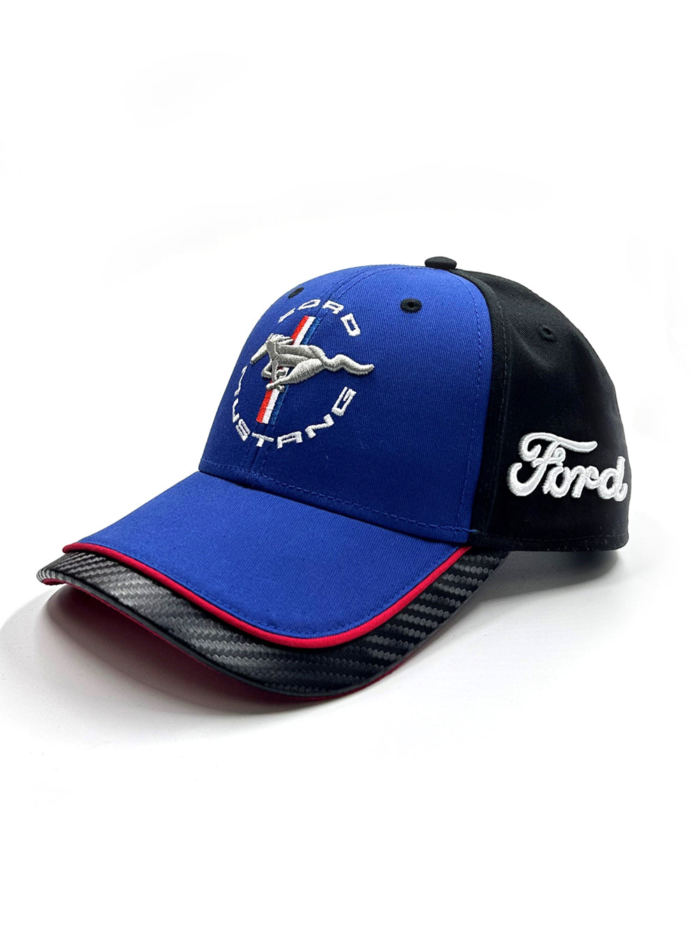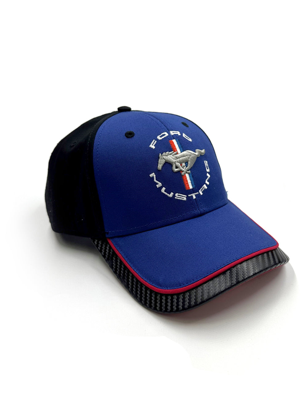 - Ford Mustang tribar circle logo embroidered on front of cap