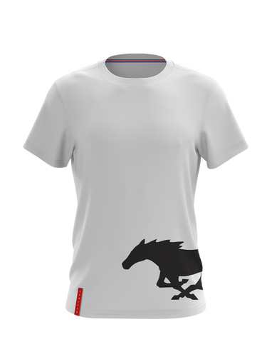 • White t-shirt with black horse across right front/side