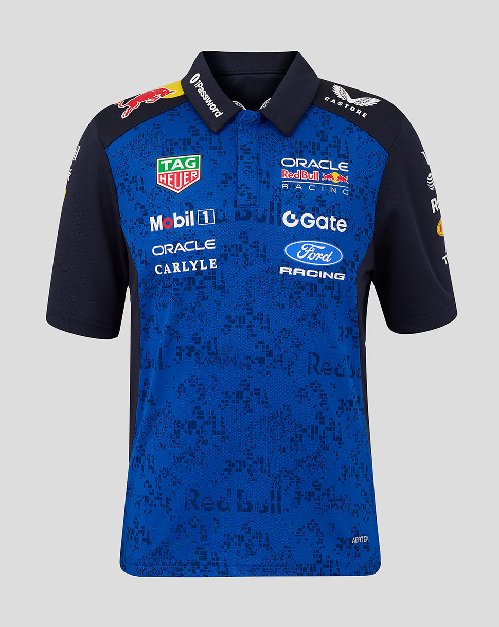 Stay fresh from lights out to the chequered flag in this comfortable Oracle Red Bull Racing replica polo shirt for junior fans, crafted with AerTek to keep you cool and dry. An authentic look from the track, it features team and partner logos and lands in a new colour and print to rock the season in style.